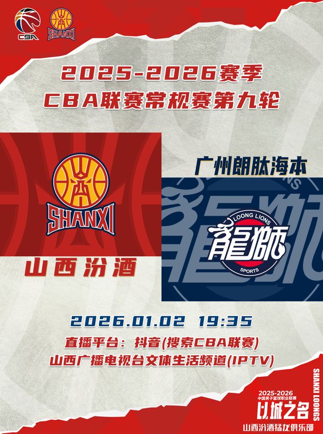 北京時間2026年1月2日19:35,2025-2026賽季CBA聯(lián)賽常規(guī)賽第九輪繼續(xù)進(jìn)行,山西汾酒迎來新年首戰(zhàn),主場對陣廣州朗肽海本,球迷觀眾可以通過抖音(搜索CBA聯(lián)賽)、山西廣播電視臺文體生活頻道(IPTV)觀看比賽實況,與我們一同觀看這場新年大戰(zhàn)!