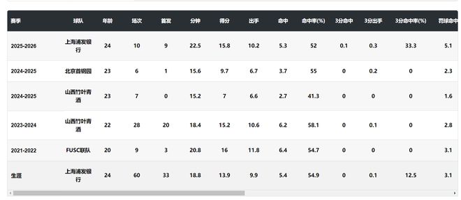本賽季的劉禹彤來到上海后迎來了自己的巔峰賽季,場均22.5分鐘,拿到15.8分4.5籃板1.1助攻0.7搶斷0.4蓋帽,命中率52%,得分是WCBA生涯新高,籃板是WCBA生涯第二高。