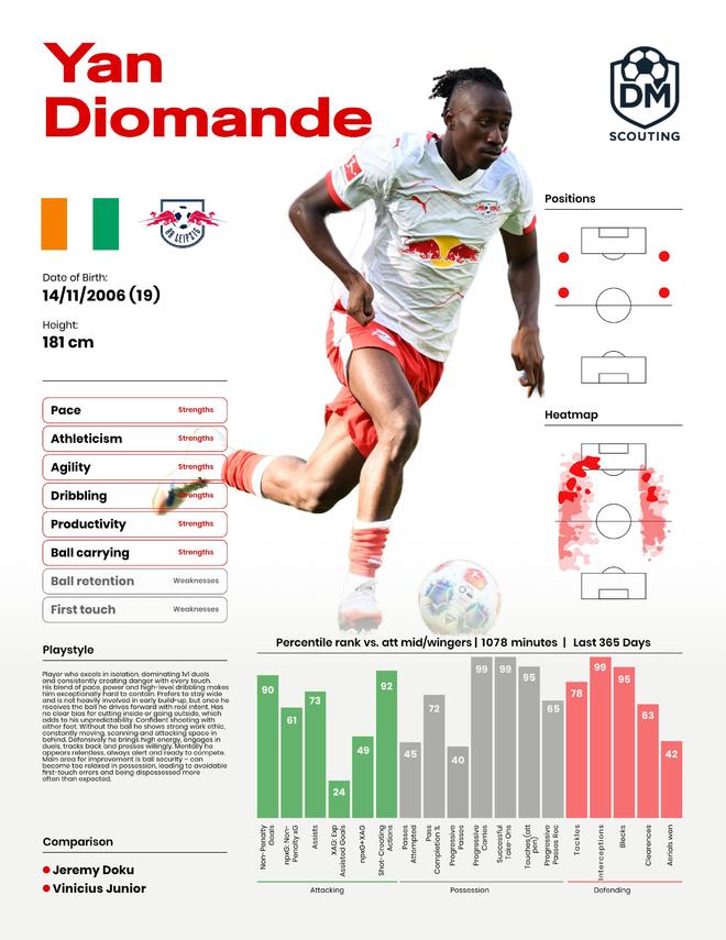 德國天空體育的弗洛里安·普萊滕貝格稱,萊比錫紅牛為迪奧曼德要價(jià)超過8700萬英鎊。但必須強(qiáng)調(diào)的是,19歲的左邊鋒迪奧曼德,只是一名被認(rèn)為具有潛力的未來型球員,而不是馬上就能決定比賽勝負(fù)的成熟球員。本賽季他在14場德甲打入6球,并有3次助攻。