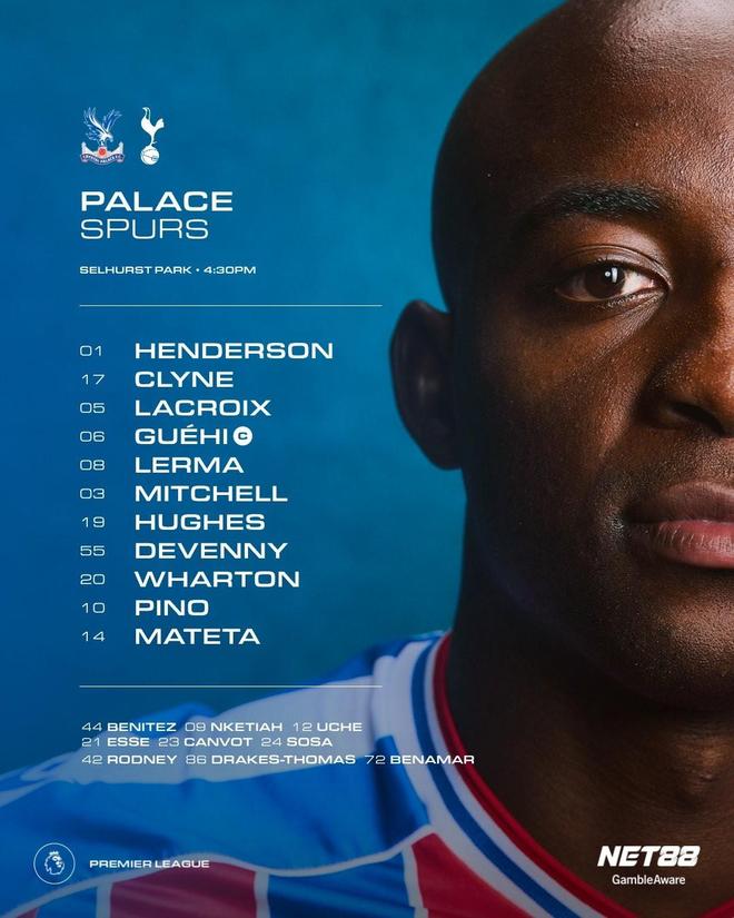 水晶宮首發(fā):1-迪恩-亨德森、8-萊爾馬、5-拉克魯瓦、6-格伊、3-米切爾、20-亞當(dāng)-沃頓、19-威爾-休斯、17-克萊因、10-耶雷米-皮諾、55-德文尼、14-馬特塔