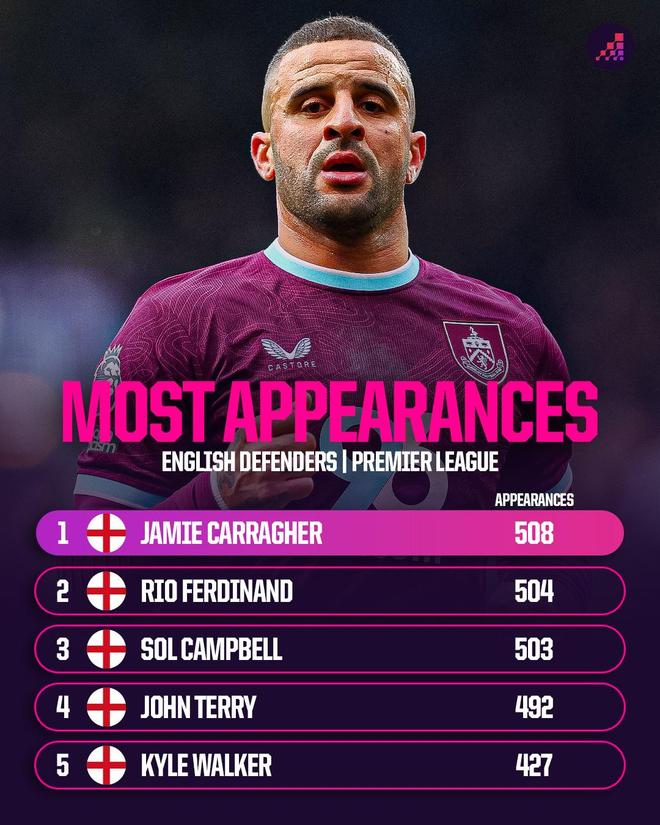 根據(jù)Opta Analyst的統(tǒng)計,在伯恩利對陣埃弗頓的比賽中,沃克完成了個人第427次英超出場,超越索斯蓋特,成為英超歷史上出場次數(shù)第五多的英格蘭后衛(wèi)。