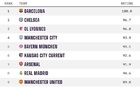 Opta女足俱樂部實力排名:巴薩女足滿分居首,切爾西女足次席